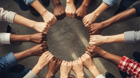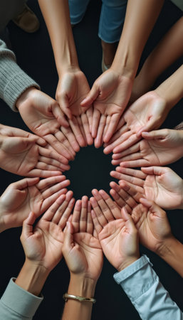 This captivating image showcases a harmonious arrangement of hands in various skin tones, forming a circle that represents togetherness and support. The hands, each unique yet collectively powerful, evoke a sense of community and shared purpose, inviting viewers to reflect on the strength found in diversity