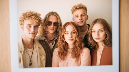 A diverse group of teenagers standing against a vibrant, multicolored background, expressing unity and youth. Perfect for concepts related to friendship, diversity, and modern fashion.