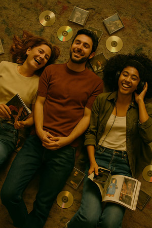 A group of young adults in a cozy cafe, engaging in conversation and activities, with a laptop and camera present