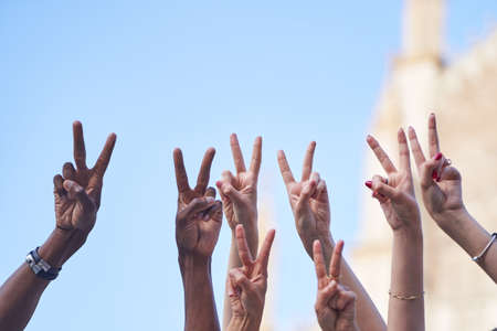 Group of multiracial people making peace or victory sign with hands. Diversity concept.
