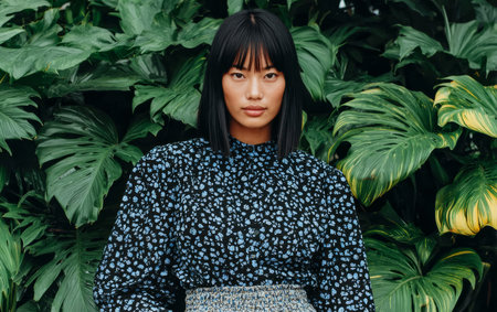 A model poses in front of large, green plants wearing a dark top with a floral pattern and a light skirt. The scene is bright and showcases natural surroundings.