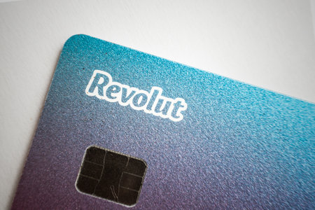 OSTRAVA, CZECHIA - NOVEMBER 12, 2019: The detail of the Revolut Mastercard debit card with radial blur effect bringing focus to the logo of this fintech company
