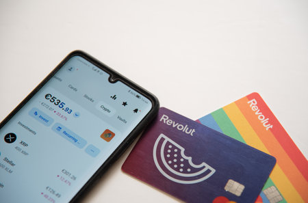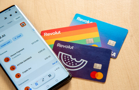 Woman use Revolut app. Mobile phone banking and investment concept photo