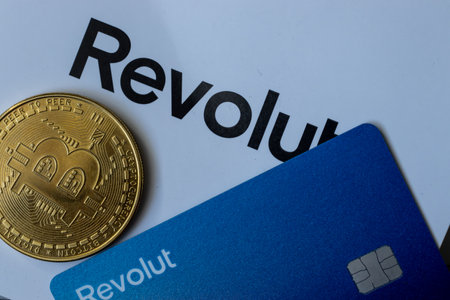 Warsaw Poland - February 18, 2023: Bitcoin and Revolut card logo. Crypto business. banking concept