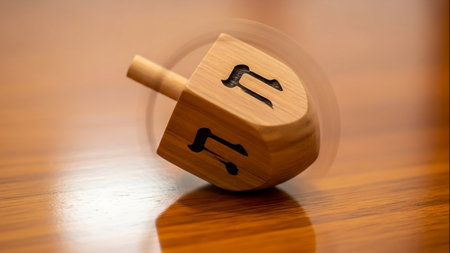 Traditional Jewish dreidel on wooden surface, symbolizing Hanukkah celebration and cultural heritage.