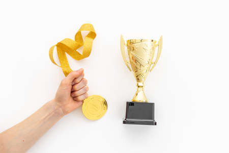 Winner and success concept. Hand holds gold medal trophy