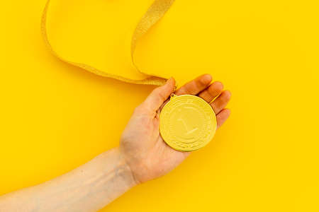 Hand holding gold medal first place. Winner of competition concept