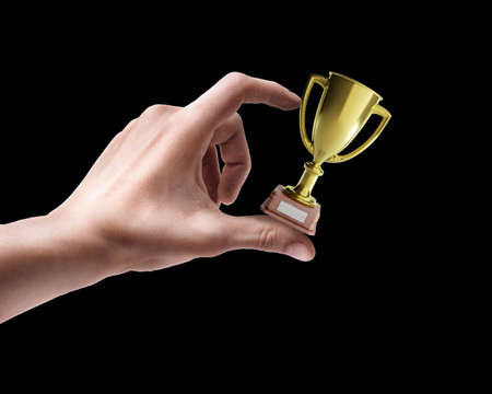 Hand holding a gold trophy. Sports, champion with trophy for achievement, goal and success.