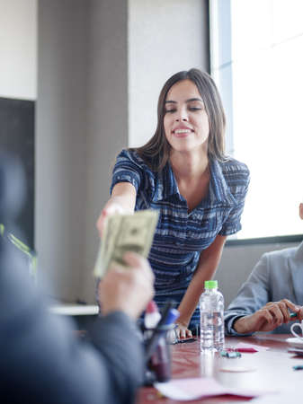 Portrait of two young businessmen in business clothes. A business woman in glasses, watching a man boss, counting money from a pack of dollar bills, gives her a salary