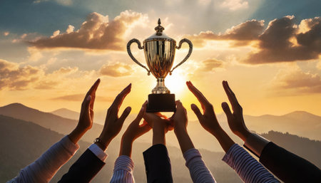 Group of hands holding a trophy on top of the mountain during sunrise