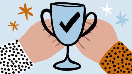 A stylized illustration of two hands holding a trophy with a check mark, symbolizing achievement and success.