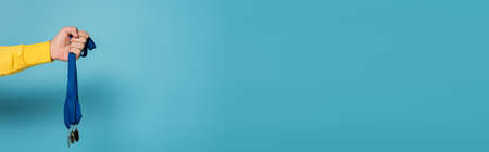 cropped view of champion holding medals on blue, banner