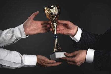Award ceremony concept. Businessman is giving a golden cup award trophy to a winner. First place background. Best worker reward. Business achievement.