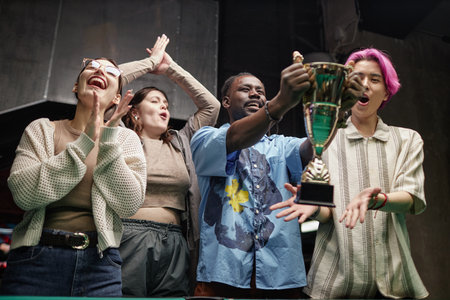 Group of diverse young people celebrating victory while holding a trophy in cozy indoor setting with joyful expressions, raising arms in excitement