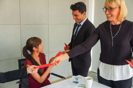 Young Asian women receive bonus or salary or money with red envelope from Caucasian boss or manager