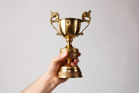 a golden color winner trophy held in hand with selective focus