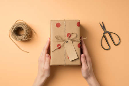 First person top view photo of st valentine's day decor female hands holding craft paper giftbox with polka dot pattern tag bow spool of twine and scissors on isolated beige background with copyspace