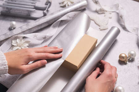 Womens hands are wrapping a Christmas present in silver wrapping paper.