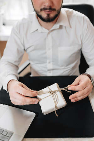 small business owner, online marketing packaging box and delivery. A parcel wrapped in brown paper. Delivery concept for private companies delivery with care. Craft present box