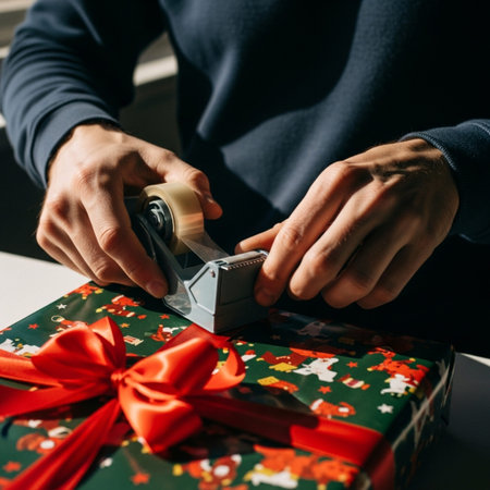 Close-up, cinematic shot of hands carefully wrapping a holiday gift with festive paper and ribbon.