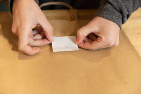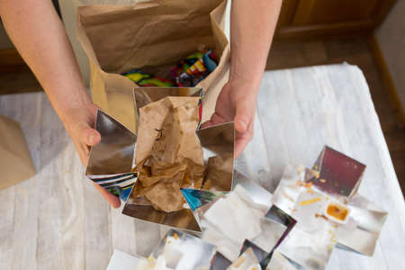 Female hands are wrapping paper bags from delivered food. Waste paper is placed in separate paper waste bins for recycling.