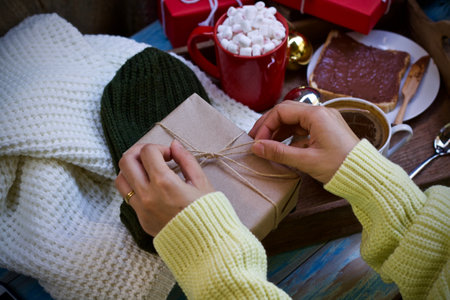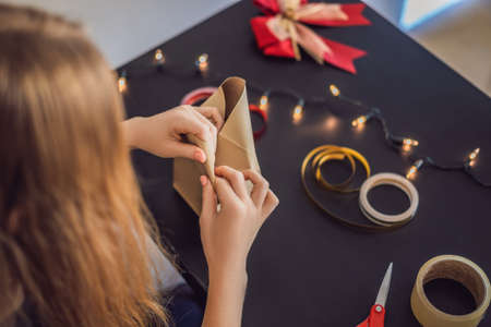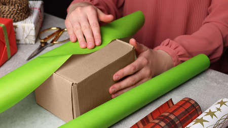 Woman in warm sweater packaging gift box with craft paper. Present for holiday event. Surprise for christmas party