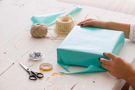 Closeup of woman's hands with gift ribbon, twine, tape and present wrapped in turquoise gift paper on white wooden background. Christmas, birthday or any other celebration preparations.
