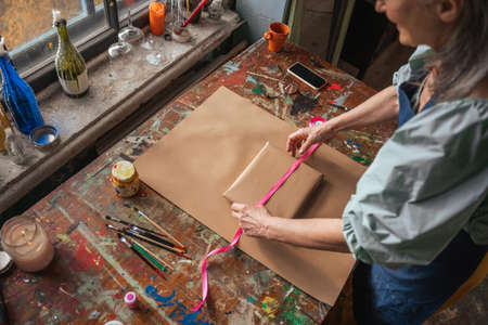 Mature woman wrapping gift with craft wrapping paper in her art room at the table