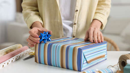 Young woman's hands wrapping Christmas gift in striped paper and decorating it with and twine and tag on white wooden background. Girl wrapping presents for the party.