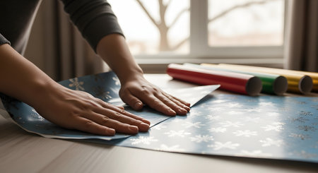 Close-up of hands carefully folding blue gift wrap with a silver snowflake pattern over a box. Rolls of colorful wrapping paper lie in the background, capturing the festive spirit of holiday preparation and DIY gift-giving.