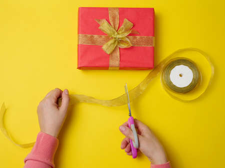 female hands are cutting a silk ribbon with scissors, next to gift boxes. Yellow background, top view