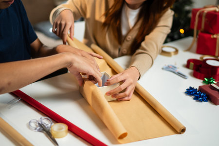 A young man and woman are happily wrapping gifts at a table, sharing a fun moment together. They are surrounded by holiday decorations, with a Christmas tree adding to the festive ambiance.