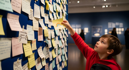 A young boy in a red sweatshirt looks up as he carefully places a small card with a rainbow drawing onto a large blue board covered in handwritten notes. The scene captures a moment of hope, community engagement, and childhood innocence in what appears to be a museum or public space.