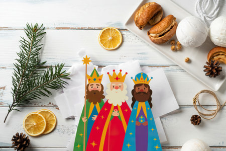 Three wise men figurines, Christmas decor, wooden surface, festive scene