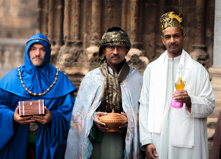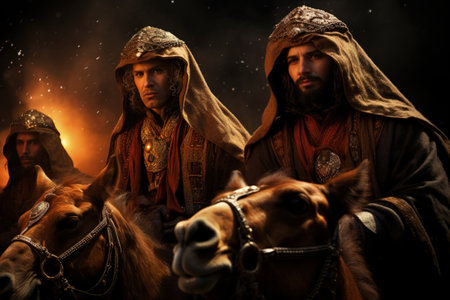 Three wise men holding gifts for Jesus. Concept for religious holiday of Epiphany, Nativity of Jesus, Three Kings Day, Christmas