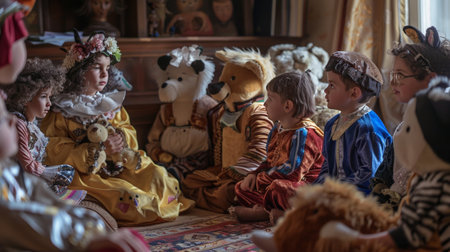A group of children dressed up in elaborate costumes perform a puppet show in the living room, a captivated audience of stuffed animals sitting in front. (theatrical, playful)