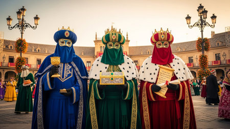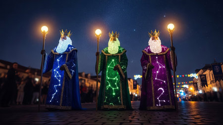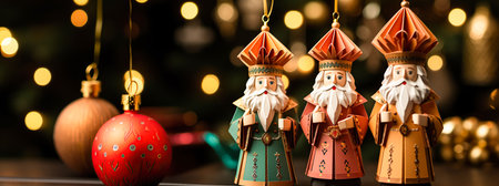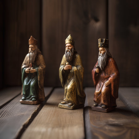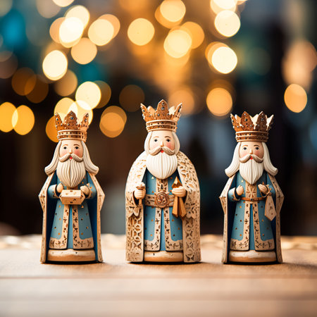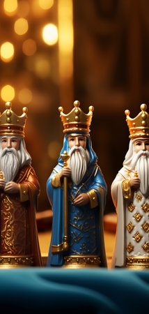 Capture the essence of celebration with three ornate king figurines set against a blurred festive background, symbolizing tradition and elegance in holiday decor.