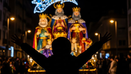 Three Kings parade at night, fireworks, festive crowd, street lights