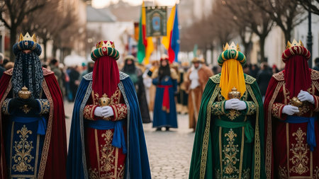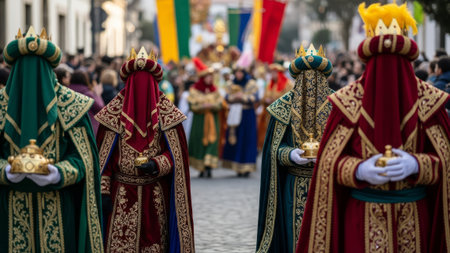 Festive three kings celebration: a joyful parade with costumed leaders and engaged crowd.