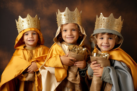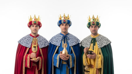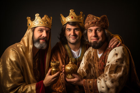 Three joyful kings adorned in crowns and regal robes, capturing the essence of celebration and tradition. Their smiles radiate warmth and camaraderie, perfect for conveying themes of friendship and festivity.