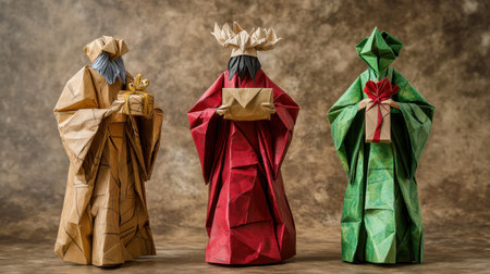 This composition features three elegant paper figures showcasing the artistry of origami. The delicate craftsmanship highlights cultural heritage and artistic expression.