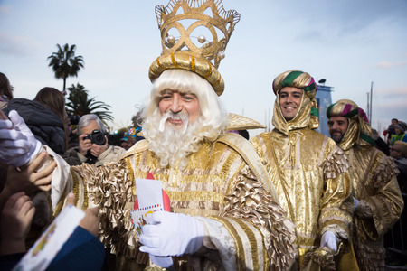 BARCELONA, SPAIN – JANUARY 5, 2017: Meeting of three magicians Melchor, Baltasar and Gaspar in port of Barcelona. Barcelona, Catalonia