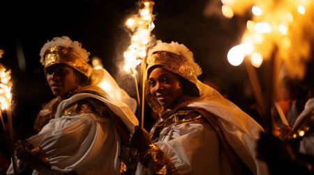 Amidst a shimmering backdrop, three regal figures embody the spirit of giving, each holding a unique gift. Their elaborate attire glimmers under twinkling lights, creating a magical atmosphere.