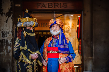 VENICE, ITALY - FEBRUARY 27, 2014: Carnival of Venice. Man and woman in the image of Eastern rulers at the festival of carnival costumes in Venice.