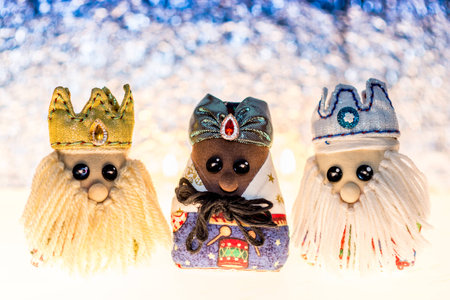 Happy Epiphany day. Three kings on golden bokeh background, vertical format