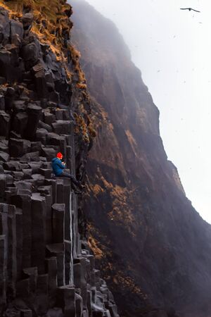 Famous black basalt mount and a man on sitting on it near the black beach Reynisfjall, Vik, South Iceland