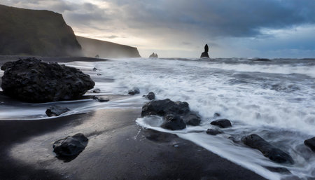 Foggy sunrise at Reynisfjara Beach, Iceland.