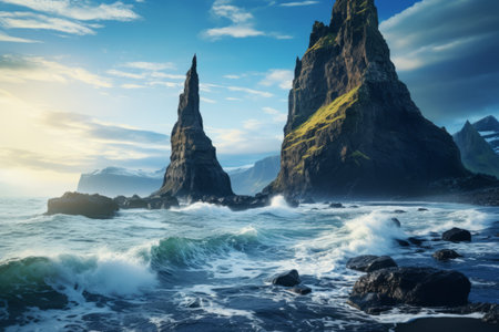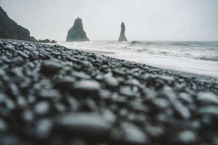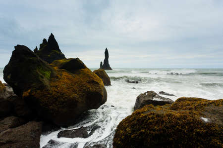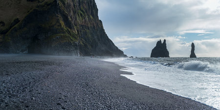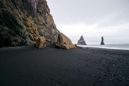 Famous Reynisdrangar rock formations at black Reynisfjara Beach. Coast of the Atlantic ocean near Vik, southern Iceland