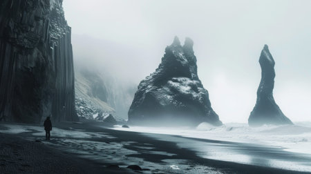 This captivating seascape presents unique rock formations shrouded in fog. The contrast of dark rocks against the misty sea creates a serene and atmospheric scene.