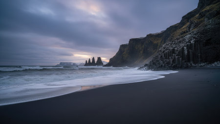 Sunrise at famous Black Sand Beach Reynisfjara in Iceland. Windy Morning.